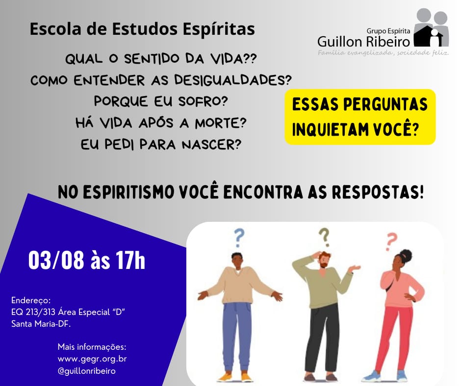 Os estudos do Espiritismo que acontecem sempre aos sábados, às 17h, reiniciarão em 03 de agosto. Para matricular-se procure por Halvécio, aos sábados pela manhã, em nossa Instituição.
